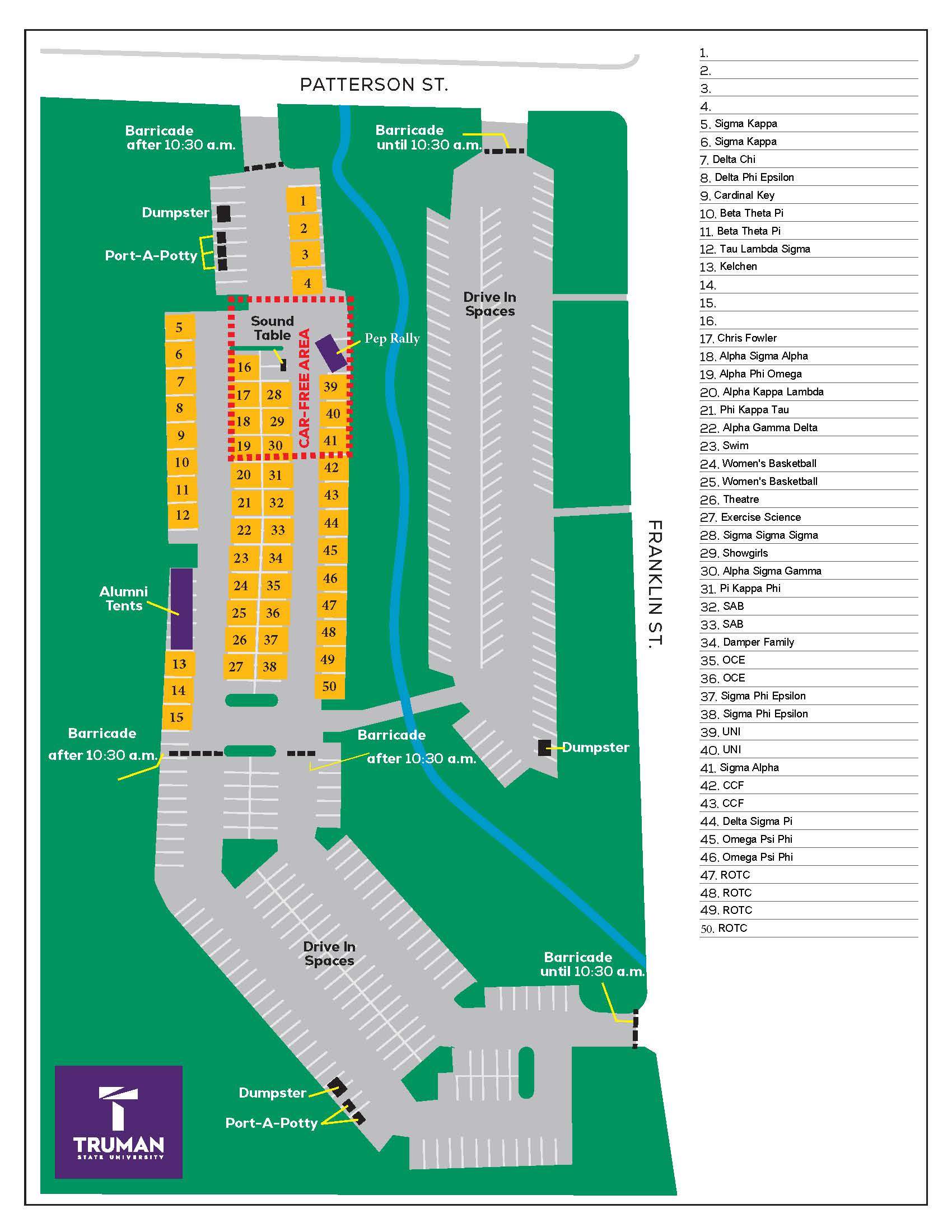 The red squared area on the Tailgate Map is a car-free area at all times. This will be a high-traffic area and there can be absolutely no cars in this zone.